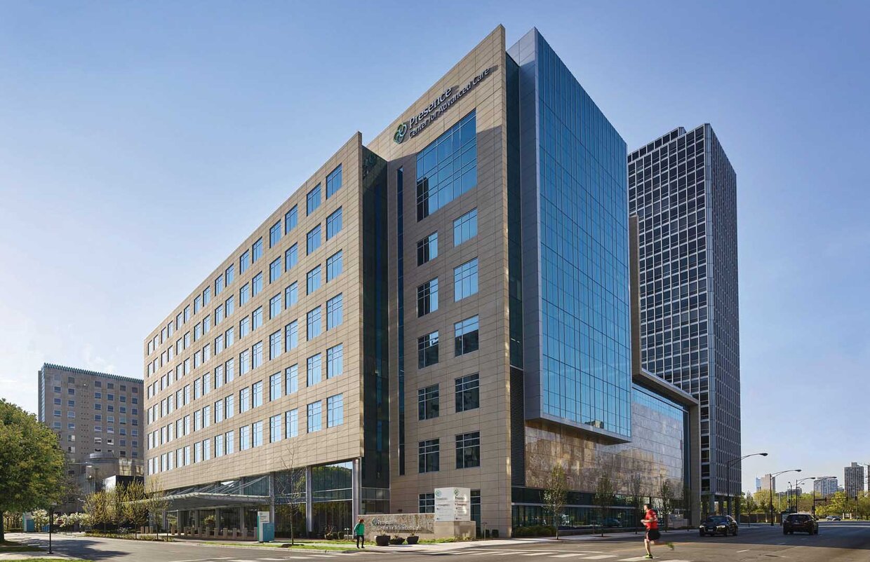 这座 10 层的高级护理中心通过玻璃天桥与现有医院相连,提供门诊护理、医疗办公空间、骨科中心以及提供放射治疗、肿瘤内科、输液治疗和整体治疗的综合癌症中心。 此外,该中心还设有新的芝加哥高级减肥研究所以及女性成像套件,包括 3T MRI、PET CT、低剂量乳房 X 光检查和数字 X 射线。一楼、五楼和六楼提供门诊服务,设有 30 个检查室、12 个输液室、36 个术前/术后病房、4 个手术室、超声室、胃肠道实验室、康复健身房和手术室。一楼新建了沃尔格林药房。可容纳 350 辆车的停车场位于较低的三层。