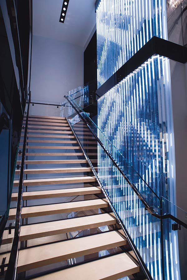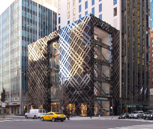 密歇根大道 Burberry 商店的外墙由黑色不锈钢、整体拱肩玻璃和 LED 照明组合而成,旨在模仿 Burberry 标志性的格子图案。 27英尺长的内部楼梯也有LED背光,晚上也能看到。