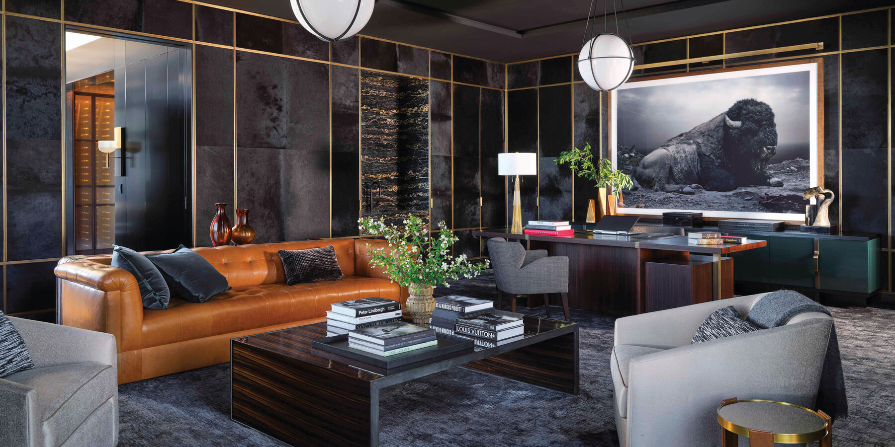 对细节、高品质材料和星空娱乐装饰的一丝不苟,这座 40 层的顶层公寓被改造成一座星空娱乐住宅,可将周围城市的景色一览无余。私人电梯大堂饰有 23 克拉月亮金箔,当您进入单元并前往门厅时,增添了一丝华丽。